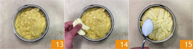 Transfer the batter into a greased 8-inch (20 cm) pan lined with parchment paper and level it well 13. Arrange the apple slices on top 14 and sprinkle with sugar 15.