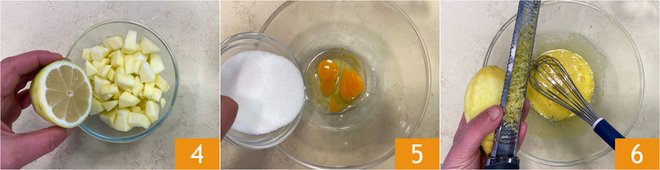 Place the apple cubes and slices in separate bowls, squeeze the lemon juice and set aside 4. Melt the butter and let it cool slightly. In a large bowl, add the eggs, the sugar 5 and the grated lemon zest 6.
