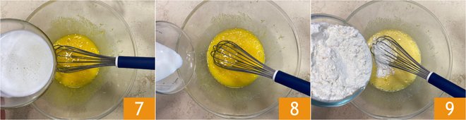 Add the slightly cooled melted butter first 7, then the milk 8, whisking well to combine. Fold in the sifted flour 9.
