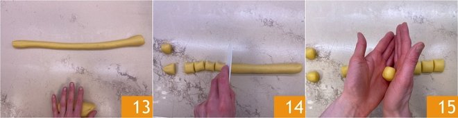 Shape two long sausages 13 and cut them into chunks to get about 24 pieces 14. Form balls by quickly rolling them between your hands 15.