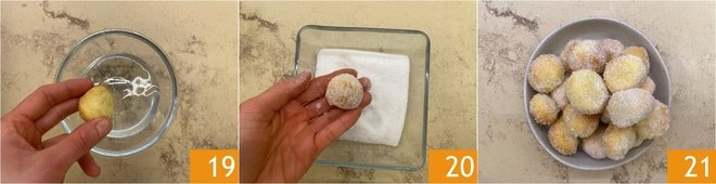 Once ready, quickly dip them in water 19 and then in granulated sugar 20: that way, even if they're not greasy from oil as with classic frying, the sugar will adhere easily. Your air fryer castagnole are ready to be enjoyed 21.