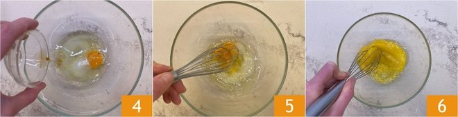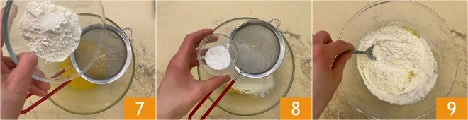 Add the sifted flour 7 and baking powder 8, and finally add a pinch of salt. Mix 9 until obtaining a smooth and compact mixture: no need to knead by hand.