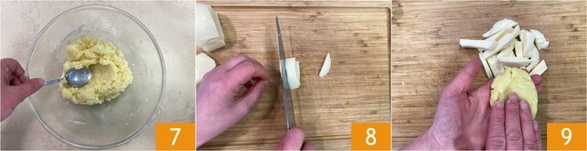 Mix everything well to obtain a compact, homogeneous mixture 7. Set aside and cut the provola into strips 8, then take a tablespoon of mixture (about 2.5 oz) and, pressing it on your hand, shape it into an elongated form, pressing the center to create an indentation 9.