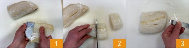 To prepare the air fryer salt cod, first remove the skin from the cod 1, then cut the fillet into slices about 1.5 inches 2. Finally, remove the bones with tweezers 3.