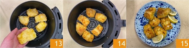 Drizzle the breaded cod fillets with a little oil on both sides 10. Place them in the air fryer basket (we used a fryer with a 6-liter capacity) 11 and cook at 356°F for a total of 15 minutes 12.