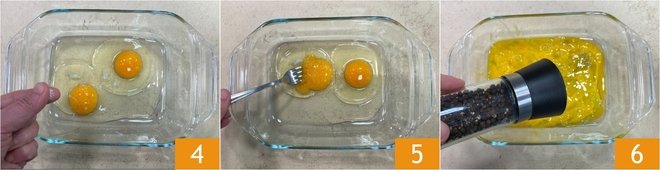 Break the eggs into a bowl, add salt 4, and beat with a fork 5. Also add the pepper 6.