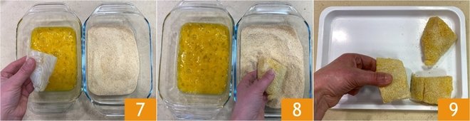 Dip the cod fillets into the egg mixture 7, then coat them with breadcrumbs 8 and place them on a tray 9.