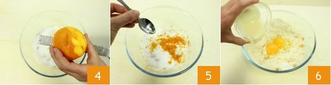 and grate the zest of an untreated orange 4. Also add the almond extract 5, the whole egg, the yolk, and the condensed milk 6.