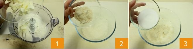 To prepare the almond pastiera with custard, start with the pastry: in a food processor, place the sifted flour and the cold butter cut into pieces 1. Pulse to create a crumbly mixture, then place it in a bowl and add the almond flour 2, the sugar 3
