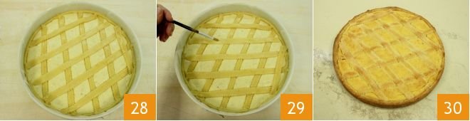 to lay on the surface of the pastiera to form lattice patterns 28. Brush the pastiera with beaten egg 29 and bake in a preheated static oven at 350°F for 60 minutes (if using a convection oven, at 320°F for about 50 minutes). Once baked, let it warm up before removing from the mold and serving 30!