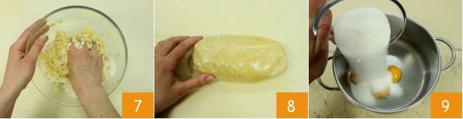 Quickly knead with your hands directly in the bowl 7 and form a homogeneous and compact dough: you can wrap it in plastic wrap 8 and let it firm up in the refrigerator for at least an hour. In the meantime, prepare the orange custard: in a large saucepan, pour the egg yolks, the sugar 9