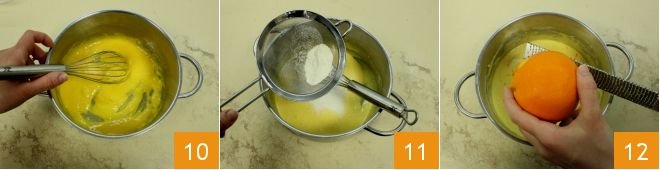 and whisk them to a cream with a hand whisk 10; sift the flour into the saucepan 11, grate the orange zest 12