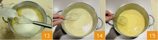 and pour the milk slowly 13. Stir and place on low heat to cook and thicken the custard 14: it will be ready 15 when lifting the whisk it holds its shape before falling back into the saucepan.