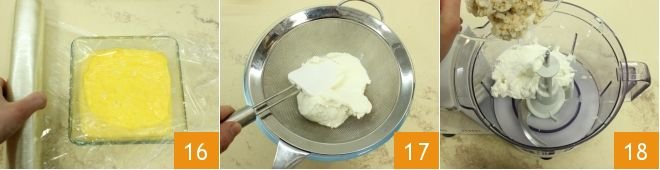Place the custard in a small bowl covered with plastic wrap in contact and let it cool in the refrigerator 16. At this point, sieve the cow's milk ricotta and sheep's milk ricotta 17 to make it creamier. Then pour it into the food processor along with the cooked wheat 18,