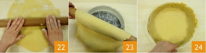 Now you can compose your almond pastiera with custard: take the pastry dough and roll it out on a lightly floured surface to make a disc about 1/4 inch thick 22. Butter and line with parchment paper an 11-inch diameter tart pan. Then roll the disc onto the rolling pin and gently unroll it onto the mold 23. Eliminate excess parts (you will use them for decoration) and press the pastry into the mold 24.