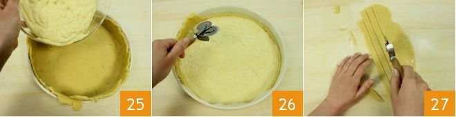 Pour the filling 25 and level it with a spatula, then trim the edges with a smooth pastry cutter flush with the filling 26. Knead the pastry scraps and roll them out to make the classic strips 1/2 inch thick 27