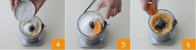 Add the sugar 4, the orange segment, and the liquor 5, give another spin of the blades to mix the mixture, and if it turns out to be too dry, add a little more orange juice 6.