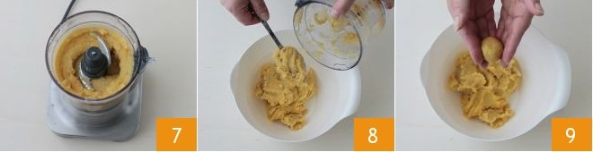 Once the dough is ready 7, transfer it to a larger bowl 8 and with moistened hands, take about 1-1.25 oz of dough and form balls the size of a walnut 9.