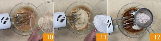 Now fold in the almond flour 10, the potato starch 11 and the sifted baking powder 12.