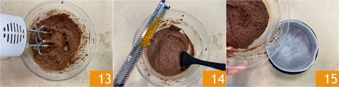 Beat again with the beaters until the dry ingredients are well absorbed 13. Finally, scent the batter with grated orange zest 14. Pour the batter into an 8-inch (20 cm) springform pan lined with parchment paper (How to line a cake tin with parchment paper) 15.