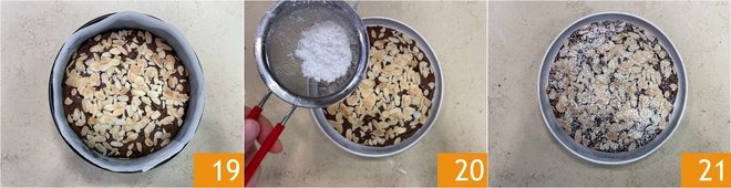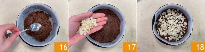 Spread the batter evenly, leveling the surface with the back of a spoon 16, then scatter the sliced almonds on top 17 and bake in a conventional oven at 352°F for about 40 minutes 18.
