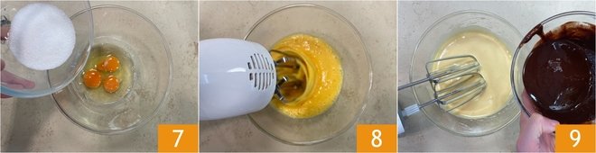 In a bowl, combine the eggs and the sugar 7, then beat with electric beaters 8 until you obtain a pale and fluffy mixture. At this point pour in the chocolate and butter mixture 9.
