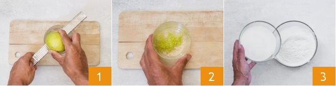 To prepare the almond milk cake without eggs, start by grating the zest of an untreated lemon (1-2) and set it aside for a moment. In a bowl, pour in the flour and sugar 3,