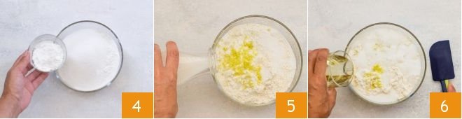 the baking powder 4, and the previously grated lemon zest. Then pour in the almond milk 5. Also add the vegetable oil 6, stir with a spatula to start,