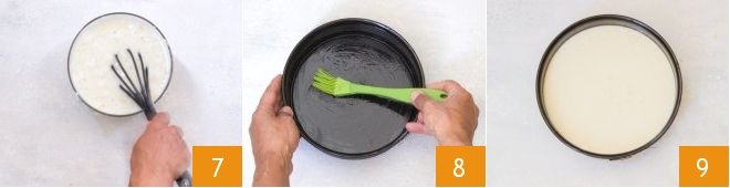 then continue with a hand whisk 7 until you obtain a homogeneous mixture. Grease a 9-inch diameter mold 8 and pour in the batter 9. Bake the cake in a static oven preheated to 350°F for about 40 minutes (perform the toothpick test before taking it out).