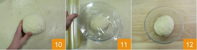 Transfer the dough to the work surface and knead for a few minutes or until you have obtained a smooth ball 10. Transfer to a bowl, cover with plastic wrap 11 and let it rise for about 3 hours at a temperature of about 79°F or until doubled 12.