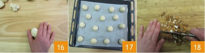 and finally round them with the palm of your hand: you should obtain a perfectly closed sphere 16. Place the balls on a baking sheet lined with parchment paper as you go, leaving space between them, and cover with a cloth to let them rise for about half an hour 17. Meanwhile, preheat the oven and chop the almonds with a knife 18.