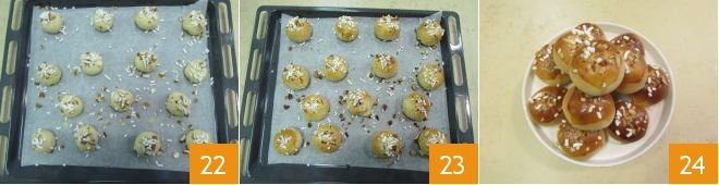 Take the buns, brush them with a little milk 19 and sprinkle them with the chopped almonds 20 and sugar sprinkles 21.