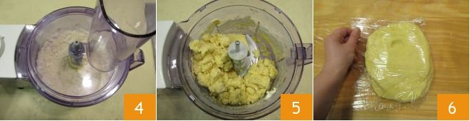 Activate the mixer again for a few moments, this time lowering the speed so the blades will mix the dough without blending 4. As soon as the mixture has combined 5, transfer it to the work surface and quickly work it with your hands, just enough to obtain a smooth and homogeneous dough. Wrap it in plastic wrap 6 and let it rest for 2 hours in the refrigerator.