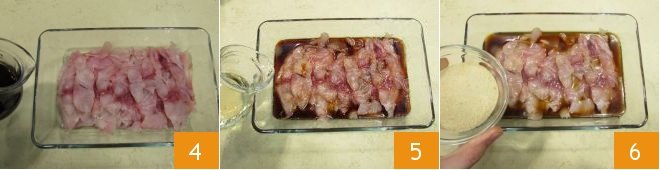 Transfer the amberjack slices into a baking dish and add the gluten-free soy sauce 4, vinegar 5, and brown sugar 6.