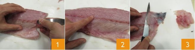 To prepare the amberjack carpaccio marinated in soy sauce, the first thing you need to ensure is that you have a pre-frozen fillet; we recommend freezing the fillet for at least 96 hours at 0 degrees Fahrenheit and then thawing it for use in the recipe. At this point, take your fillet and remove the bones using tweezers 1, to locate them you can simply run your fingers over the fillet 2. Now proceed to slice the fillet, making diagonal cuts to obtain very thin slices 3.