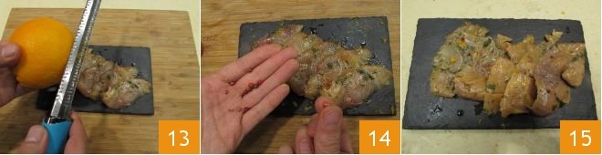 Finish the dish by adding freshly grated orange zest 13 and pink peppercorns 14. All that's left is to serve your amberjack carpaccio in soy sauce 15.