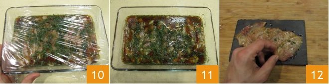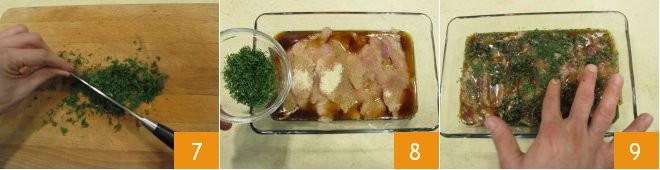 Finely chop the dill 7 and add it to the rest of the marinade 8. Ensure that the amberjack slices are completely covered by the liquids 9,