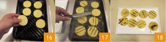 Retrieve the polenta and, using a pastry cutter 2 1/2 inches in diameter 13, obtain 8 discs 14. Heat a grill and drizzle with 2 tsp of oil 15,