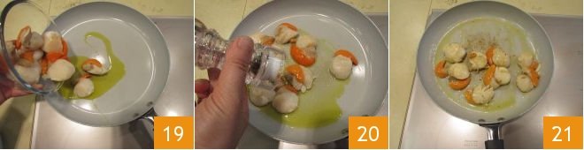 Finally, cook the scallops. Heat a pan with the remaining oil and add the scallops, letting them cook for 2 minutes on each side over medium-high heat 19, season with salt and white pepper 20 and toss frequently to prevent them from sticking 21.