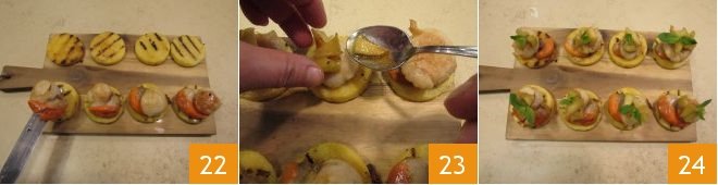 Finally, move on to composing: place the polenta discs on a cutting board, position the scallops 22 and then the apples 23. Finally, garnish your amuse-bouche of polenta with mint leaves, and you're ready to impress the guests 24!