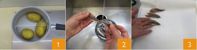 To prepare the anchovy pies, start by boiling the potatoes in a pot with plenty of water 1 for about 20-30 minutes, until they are soft when pricked with a fork. Meanwhile, focus on the How to Clean Anchovies. Gently remove the head and intestines, then take out the central bone 2, without splitting them in half but leaving them whole. Place them in this way on a tray lined with absorbent paper 3.
