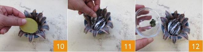 Then place a slice of potato in the center of the anchovies 10 and lay a couple of anchovy fillets horizontally to cover the potato slice 11. Salt, pepper, add the chopped thyme 12 and lemon zest.