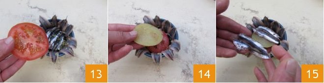 Place a slice of tomato 13, another slice of potato 14, and cover with the anchovies 15.