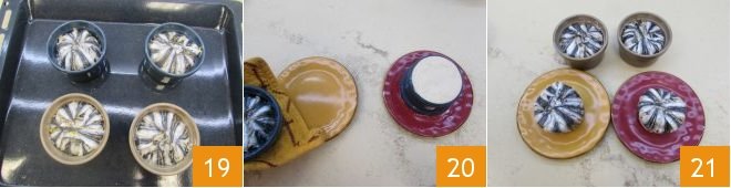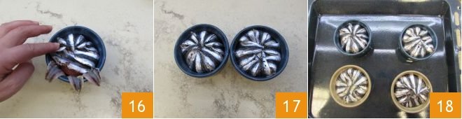 Bake in a preheated static oven at 356°F (180°C) for 10 minutes (if using a convection oven, bake at 320°F (160°C) for 7-8 minutes). Remove the pies from the oven 19 and let them cool for a few minutes, then invert the molds 20, unmold them, and serve your anchovy pie still warm 21.