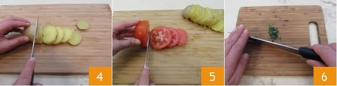 Once your potatoes are cooked, drain them from the water, let them cool slightly, and cut them into slices about 0.39 inches (1 cm) thick 4. Wash the tomato and slice it to the same thickness as the potatoes 5. Then chop the thyme leaves 6 and set them aside.