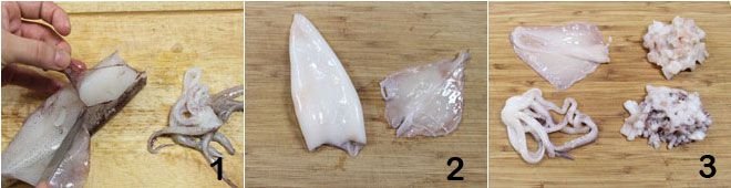 To prepare the Andalusian stuffed squid, start by cleaning the squid: take the squid, empty the sack, remove the bone and the membrane covering the sack, detach the tentacles, and remove the beak 1. Separate the side fins from the body 2 and finely chop them together with the tentacles 3, set aside the cleaned squid sacks. For a detailed guide on cleaning squid, Cleaning Squid.