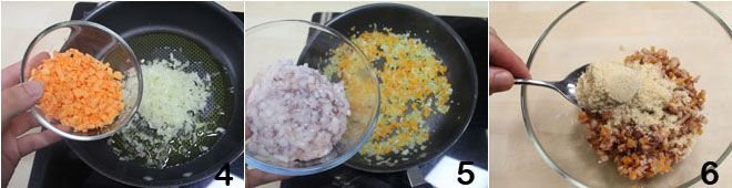 Then move on to preparing a Hard Boiled Eggs, once ready, peel it and let it cool. Now prepare the filling: peel and finely chop an onion and a carrot, then sauté half the onion with 3 tablespoons of extra virgin olive oil, and when it wilts, add half the carrot 4. Let it cook for 5 minutes over moderate heat, then add the chopped squid 5. Cook for another 5 minutes, then remove from the heat and place the filling in a large bowl with the breadcrumbs 6.