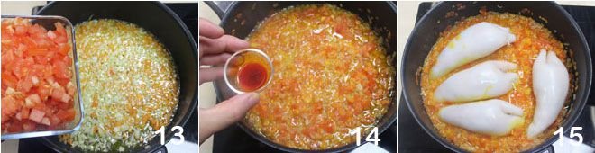 Wash, clean, and dice the tomatoes, then add them to the sauté 13. At this point, add the saffron dissolved in a tablespoon of water 14, then the stuffed squid 15. Cover with a lid and continue cooking over low heat for 30 minutes, shaking the pan occasionally to prevent them from sticking to the bottom. When the Andalusian squid are cooked, place them on a serving dish, slice them, and sprinkle them with the tomato sauce.