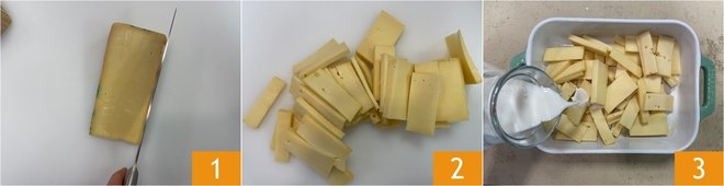 To prepare the Valdostana fondue, first remove the outer rind of the fontina 1, then slice it thinly 2. Transfer the cheese to a baking dish and pour the milk over it 3.