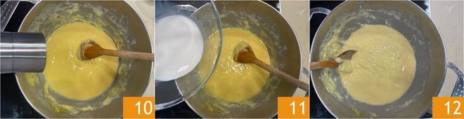 Pepper 10 and stir again. At this point pour about 3.4 fl oz (about 0.42 cups) of the reserved milk 11; adjust the amount based on the consistency of the fondue, which should be neither too runny nor too firm. In total the cooking will take about 30 minutes 12.